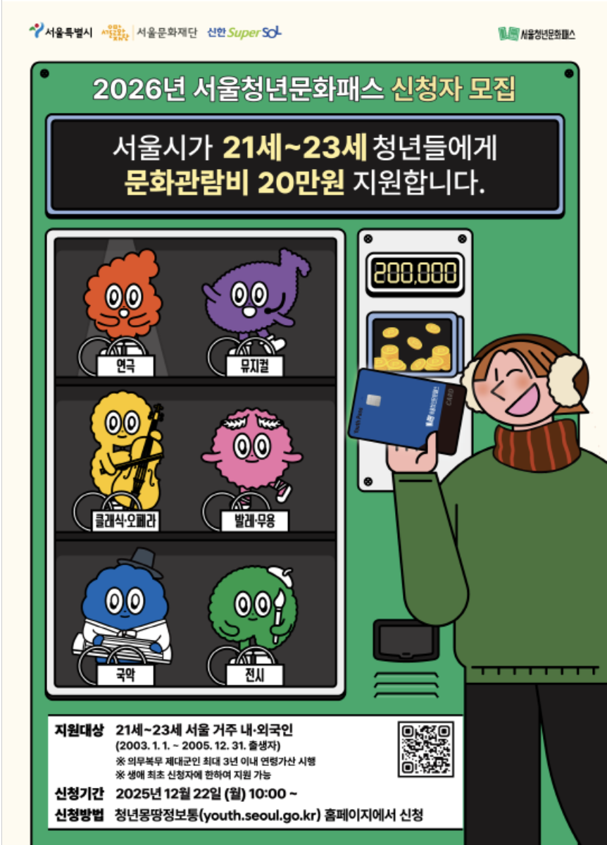 2026년 서울청년문화패스 신청자 모집|지원 대상 및 신청 방법 안내서울시에서 2026년 서울청년문화패스 신청자를 모집한다.서울청년문화패스는 청년층의 문화예술 향유 기회를 확대하기 위한 지원 사업으로,공연·전시 등 문화 활동을 경험할 수 있도록 일정 금액을 지원하는 제도다.신청 기간과 대상 조건을 확인해 정리해봤다. 서울청년문화패스 모집 개요이번 모집은 온라인 접수를 통해 진행되며,예산 소진 시 조기 마감될 수 있다.지원 대상에 해당한다면 신청 기간을 놓치지 않는 것이 중요하다. 사업명: 2026년 서울청년문화패스 신청 기간: 2025년 12월 22일 ~ 2026년 12월 31일 (※ 예산 소진 시 조기 마감) 접수 시작: 2025년 12월 22일(월) 10:00부터 접수 방법: 온..