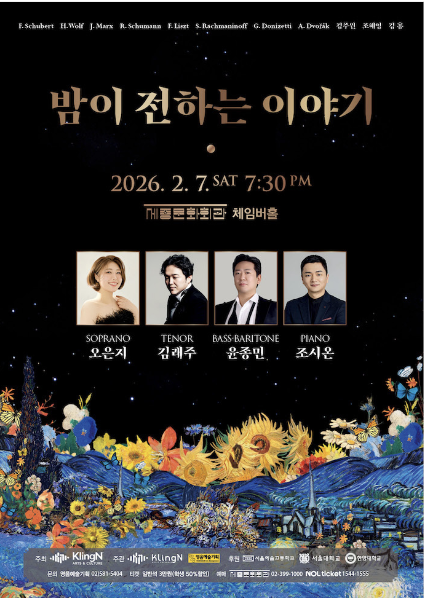 밤이 전하는 이야기|소프라노 오은지·테너 김래주·베이스바리톤 윤종민 공연 안내「밤이 전하는 이야기」는 소프라노 오은지, 테너 김래주, 베이스바리톤 윤종민이 함께하는 성악 공연으로, 밤이라는 시간대가 가진 정서와 이야기를 음악으로 풀어내는 무대다. 세 명의 성악가가 들려주는 각기 다른 음색과 하모니를 세종체임버홀의 공간에서 가까이서 감상할 수 있는 공연이다.공연 개요이번 공연은 성악 앙상블 형식으로 구성되며, 각 성부의 개성이 자연스럽게 어우러지는 프로그램으로 진행된다. 대규모 무대보다는 연주자와 관객 사이의 거리가 가까운 체임버홀 공연으로, 음악에 더욱 집중할 수 있는 환경이 마련된다.공연명: 밤이 전하는 이야기출연: 소프라노 오은지 / 테너 김래주 / 베이스바리톤 윤종민일정: 2026년 2월 7일시간:..
